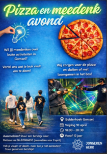 Jongerenwerk nodigt jongeren uit Gorssel uit om mee te denken over leuke activiteiten in… Lees verder Vrijdag 10 april: Pizza en meedenkavond Gorsselse jongeren